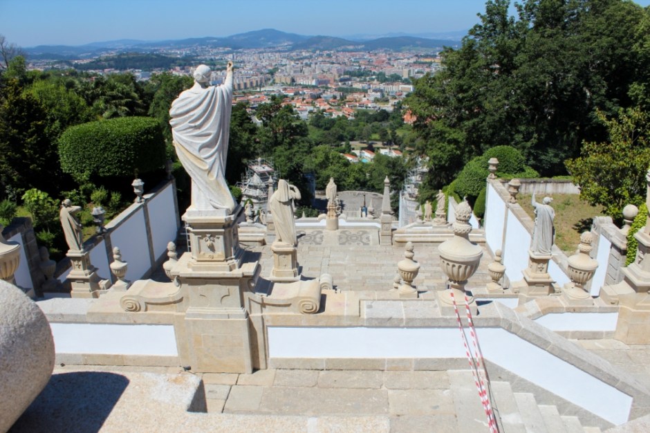 O escadório, num total de 581 degraus, culmina no Terreiro de Moisés, onde se localiza a Fonte do Pelicano e a Estátua de São Longuinho, a que se segue o adro e a Igreja do Bom Jesus.