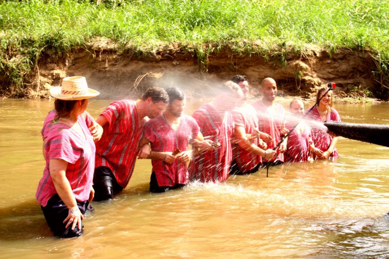 Ao lado do poço passa um rio, onde mais uma vez todos somos convidados a dar banho nas grandonas, mais um de muitos pontos altos desse passeio. Removemos a lama dos bichos com um tipo de esponja que preparamos lá no início do passeio, depois a maior levanta um por um pela tromba, finalmente nos damos os braços e a mesma que nos levantou enche a tromba de água e taca na nossa cara… haha..