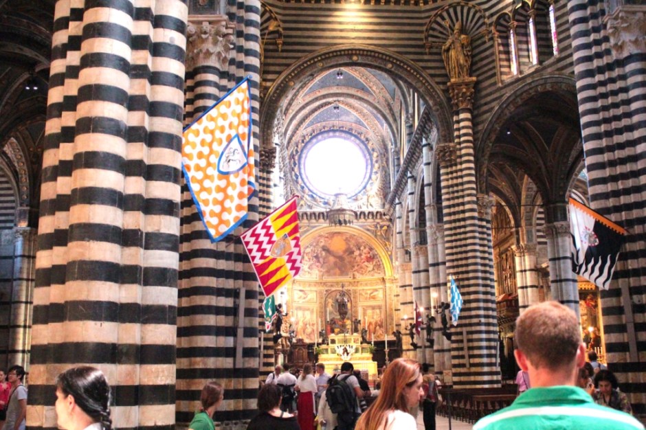O Melhor de Siena é o interior da Catedral Santa Maria Assunta, também conhecida como o Duomo de Siena. Foi construída entre 1220 e 1370, sendo um dos principais exemplos da arquitetura Românica-Gótica da Toscana. Toda ela é revestida por dentro e por fora de mármore branco de Carrara e verde de Prato (que a distância parece preto), formando as cores de Siena: Preto e Branco.