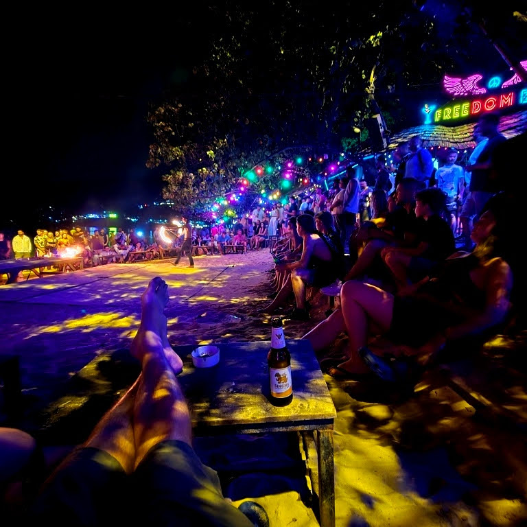 Na Praia Loh Dalum Beach, no lado direito tem uns bares com apresentação de Malabarismo com Fogo, música alta e muita animação. Vale a pena dar um pulo lá.